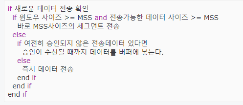 1. 상대방이 받을 수 있는 사이즈(window size)와 전송해야할 데이터가 MSS(최대 세그먼트 크기) 보다 크다면 문제없이 바로 전송