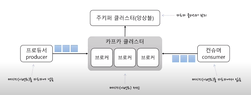 - 주키퍼 클러스터 - 카프카 클러스터를 관리하는 역할을 합니다.