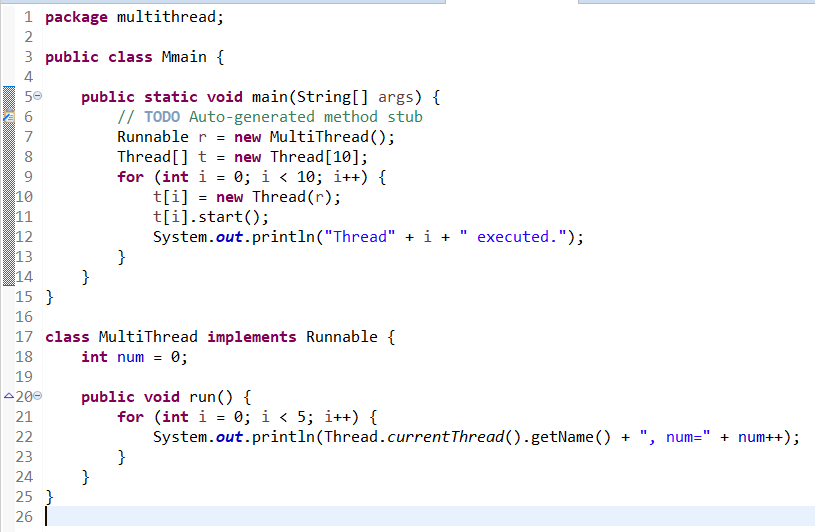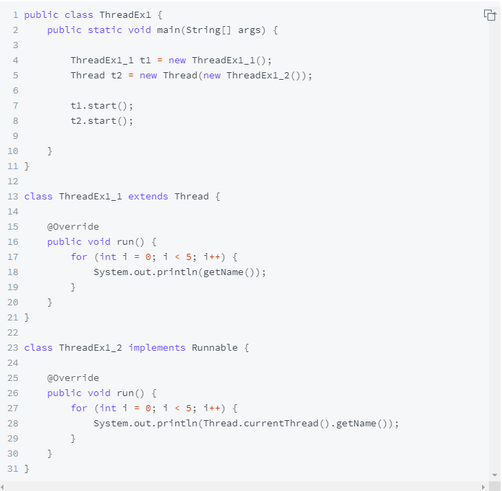 또한, Thread 클래스를 상속받은경우, 자손 클래스에서 조상 클래스 Thread 클래스의 메소드를 직접 호출할 수 있지만, Runnable을 구현하면 Thread클래스의 static 메소드인 currentThread()를 호출하여 쓰레드에 대한 참조를 얻어와야 호출 가능하다.