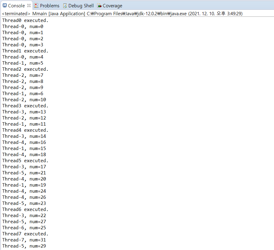 Thread를 10개를 생성하고 각 Thread에서 5개의 숫자를 출력시키는 프로그램을 짜보았다.